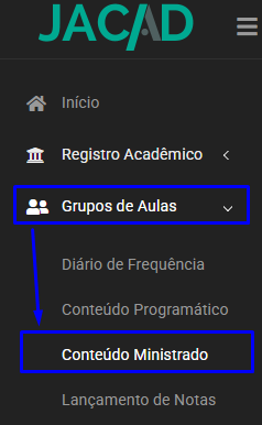 Acesse o menu Grupo de Aulas e clique em Conteúdo Ministrado.