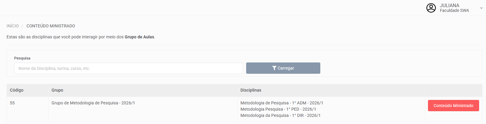 Será apresentado o grupo de aula e as respectivas disciplinas vinculadas ao grupo, para acessar clique no botão Conteúdo Ministrado.