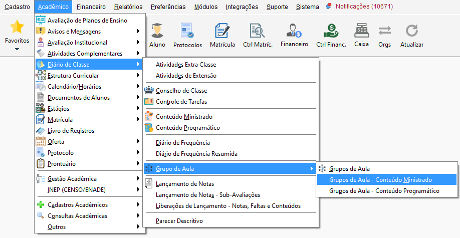 Acesse o menu Acadêmico, navegue até Diário de Classe, vá até Grupo de Aula e clique em Grupos de Aula - Conteúdo Ministrado ou Grupo de Aula Conteúdo Programático.