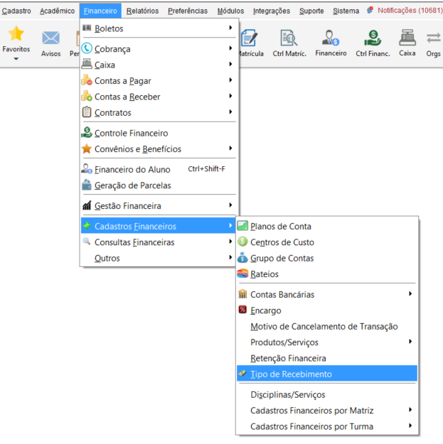 Acesse o menu Financeiro e percorra até Cadastros Financeiros e clique em Tipo de Recebimento.