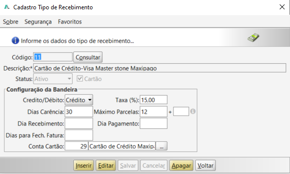 Apagar: Exclui o tipo de recebimento selecionado.