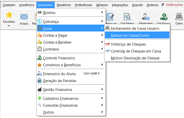 Acesse o menu Financeiro, navegue até Caixa clique em Saldos em Caixa/Conta.