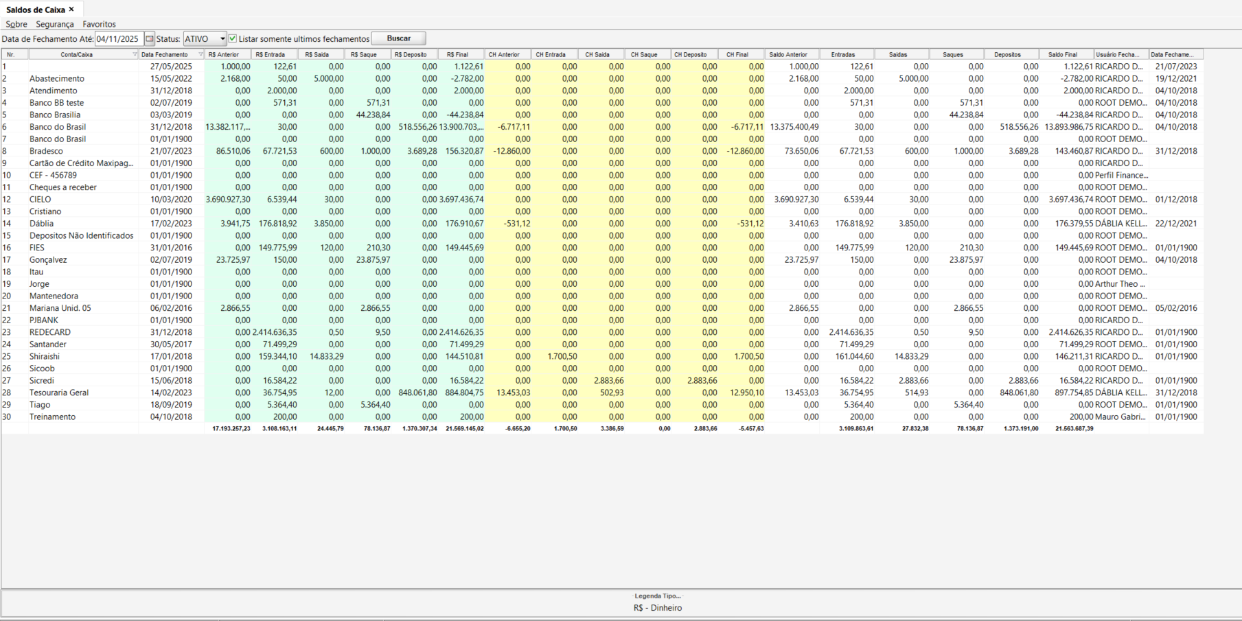 Com essa visão centralizada, o sistema permite verificar rapidamente o saldo atual de cada caixa, identificar discrepâncias, e manter o controle contábil preciso.