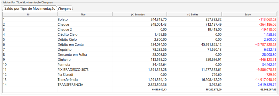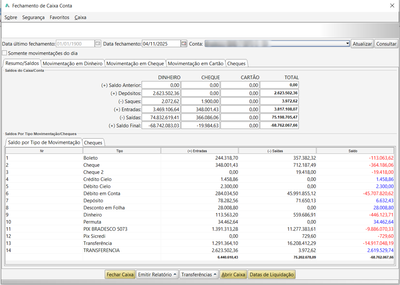 Logo abaixo do resumo, encontra-se o painel Saldo por Tipo de Movimentação e Cheques, onde o sistema lista detalhadamente todas as operações que compõem o saldo do caixa.