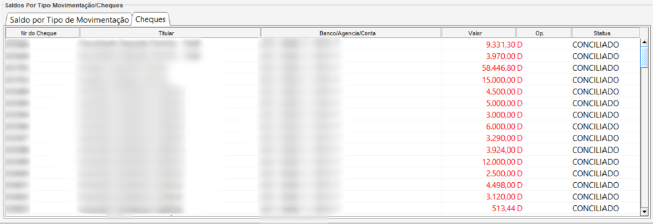 Ela faz parte da área de Saldos por Tipo de Movimentação/Cheques, e tem como função principal controlar, registrar e conciliar os cheques emitidos ou recebidos associados à conta selecionada.