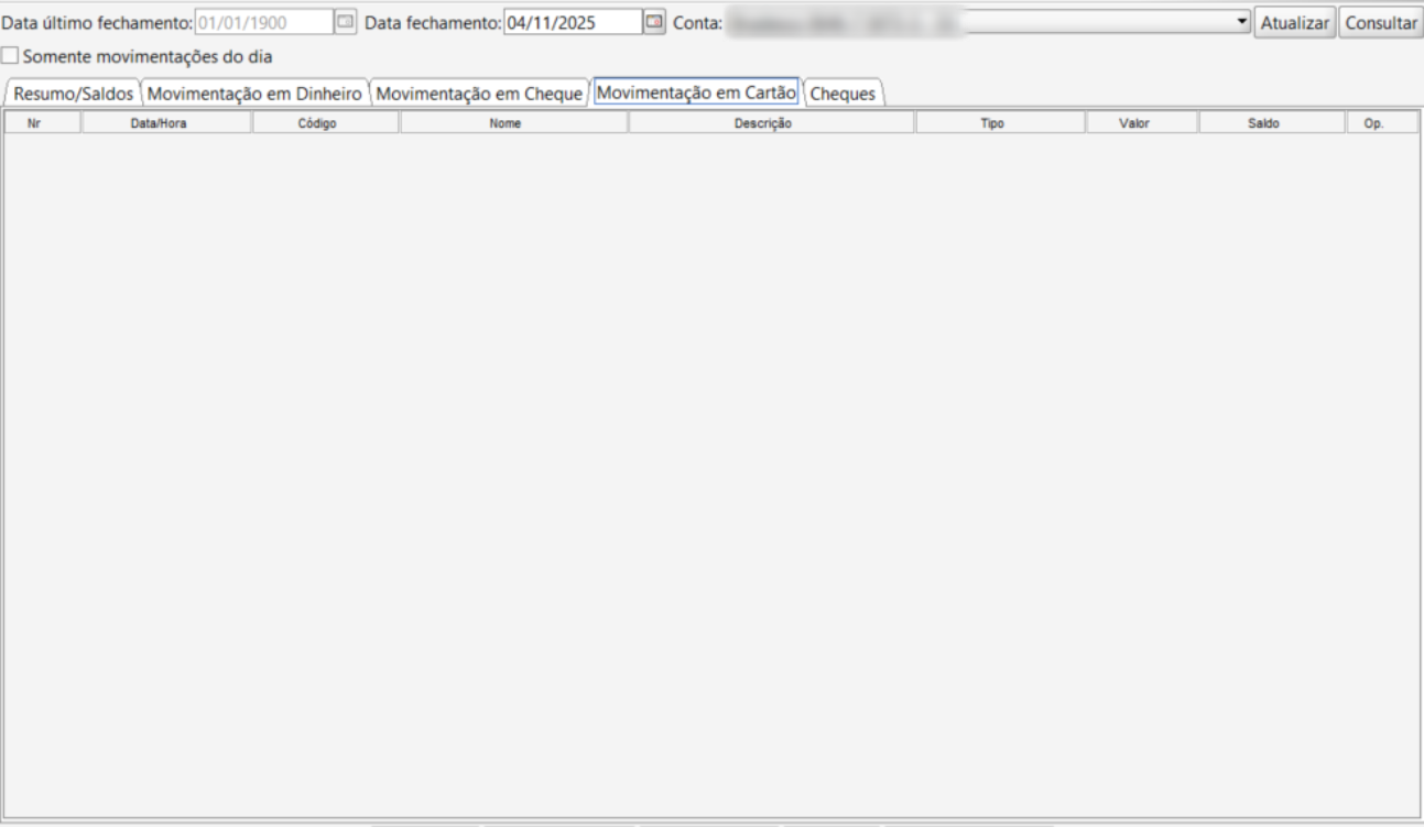 A aba Movimentação em Cartão tem como objetivo registrar e exibir todas as movimentações financeiras realizadas através de cartões de crédito e débito, sejam elas referentes a vendas, recebimentos ou estornos.