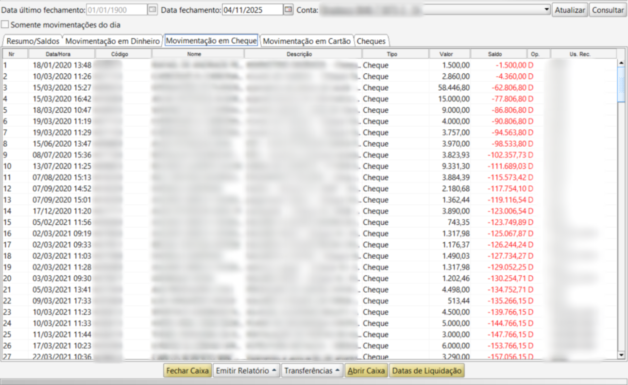 - Banco/Agência/Conta: Indica os dados bancários vinculados à operação: número do banco, agência e conta onde o cheque foi lançado;
