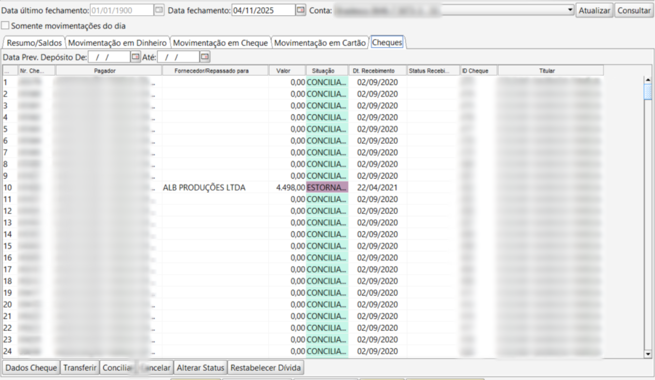Essa visão é essencial para o setor financeiro ou tesouraria, pois permite acompanhar cada cheque individualmente, verificando se foi conciliado, compensado ou ainda está pendente.