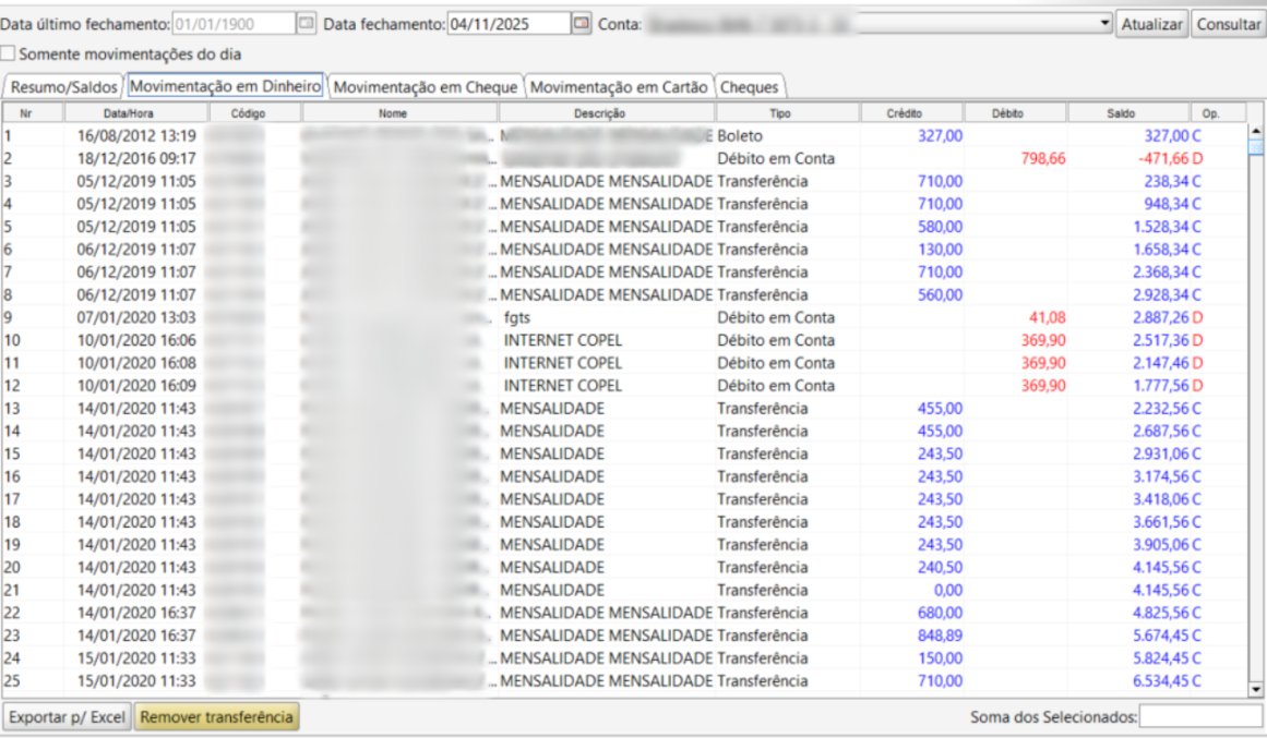 A aba Movimentação em Dinheiro apresenta o registro detalhado de todas as movimentações financeiras realizadas em dinheiro, débito em conta ou transferência bancária, relacionadas à conta e data de fechamento selecionadas.