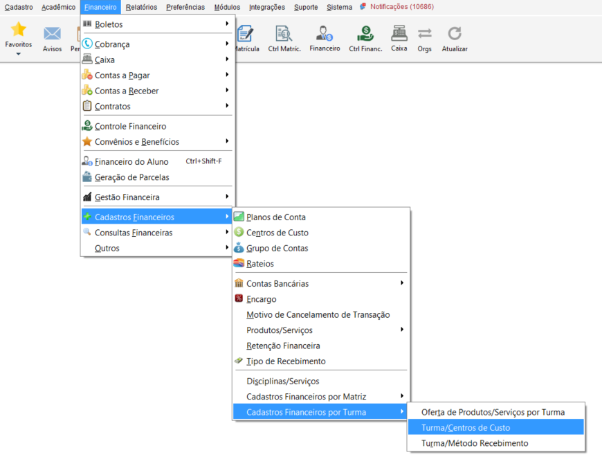 Acesse o menu Financeiro percorra até Cadastro Financeiros, vá até em Cadastro Financeiros por Turma e clique em Turma/Centros de Custo.