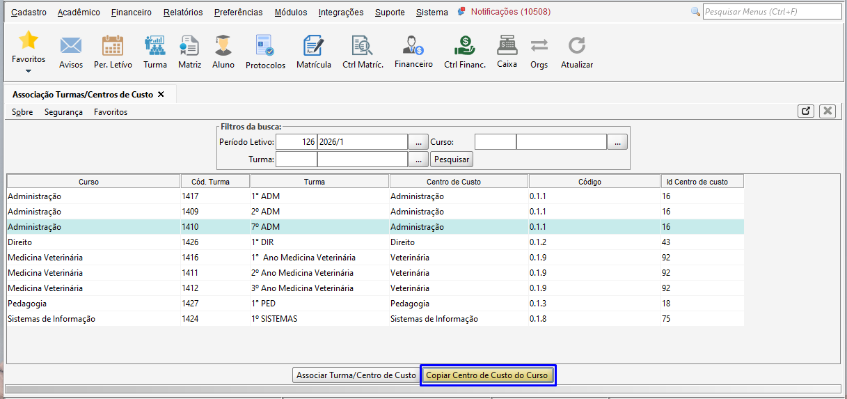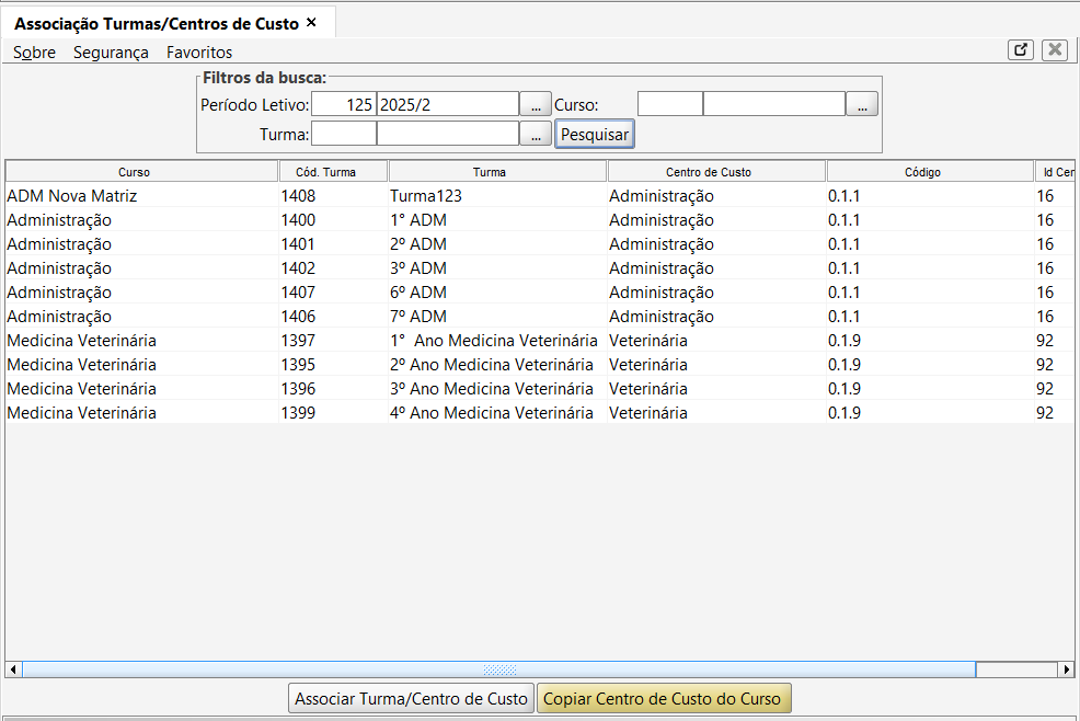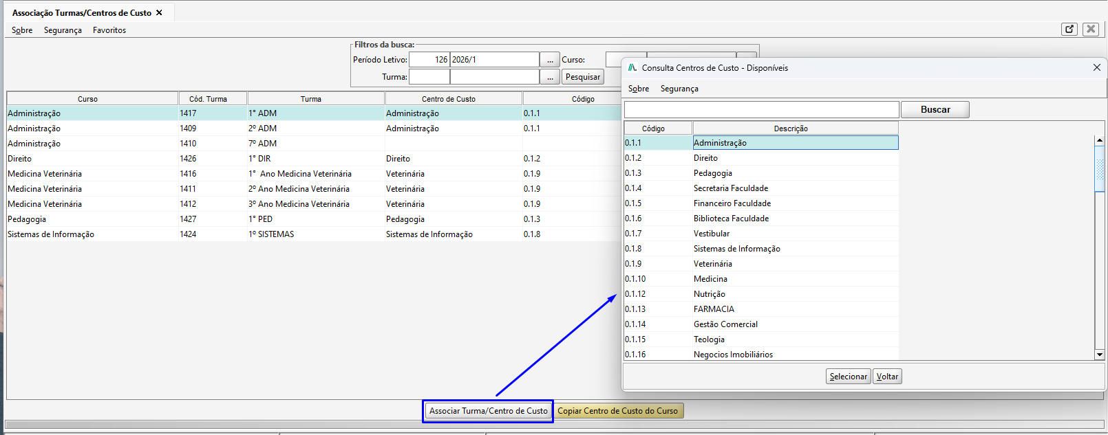 Através dessa tela, o usuário pode localizar turmas por período letivo, curso ou código, e definir ou copiar o centro de custo vinculado. O recurso contribui para uma gestão financeira mais organizada, assegurando a integração entre os dados acadêmicos e contábeis da instituição.