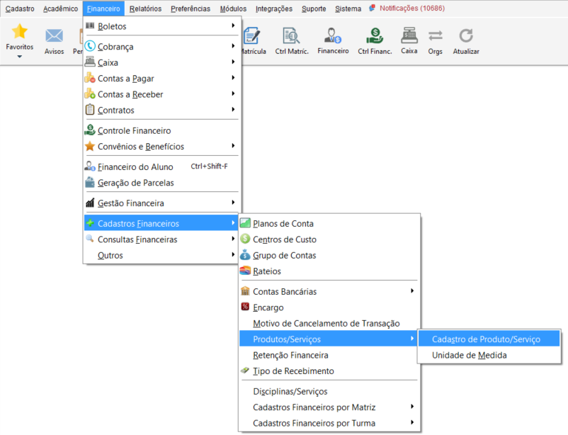 Acesse o menu Financeiro percorra até Cadastro Financeiros, vá até em Produtos/Serviços e clique em Cadastro de Produto/Serviço.