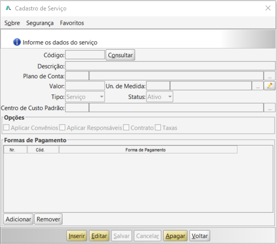 A tela de Cadastro de Serviço tem como finalidade permitir o registro de serviços ou produtos utilizados pela instituição.