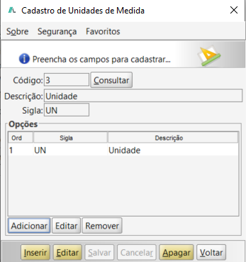 Embora nem sempre seja utilizada, a Unidade de Medida pode ser cadastrada quando necessária, especialmente em casos de produtos que exigem nota fiscal.