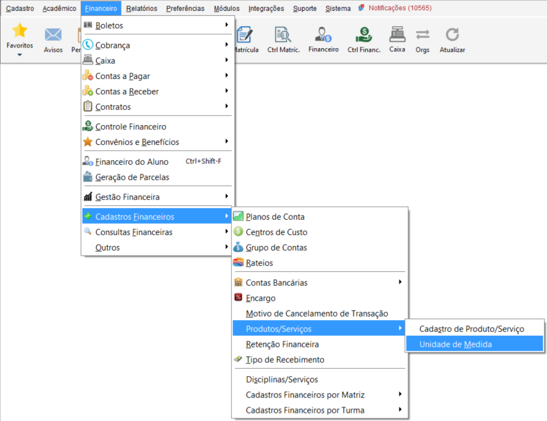 Acesse o menu Financeiro percorra até Cadastro Financeiros, vá até em Produtos/Serviços e clique em Unidade de Medida.
