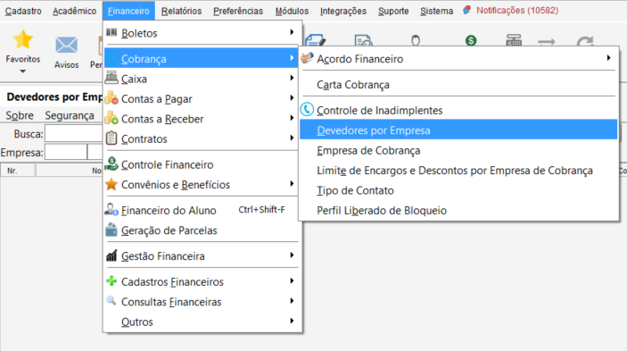 Acesse o menu Financeiro percorra até Cobrança e clique em Devedores por Empresa.