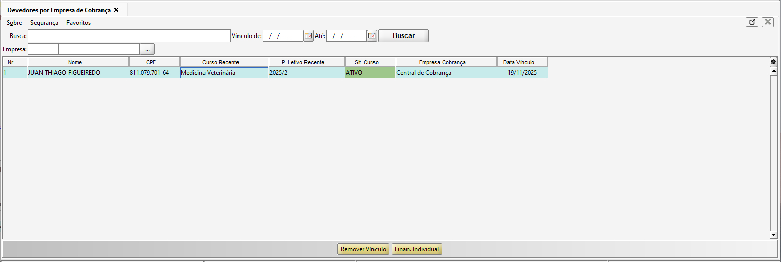 Remover Vínculo: Remove o vínculo de cobrança entre o devedor selecionado e a empresa.