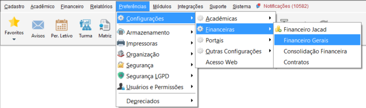 Acesse o menu Preferências percorra até Configurações, vá até Financeiro e clique em Financeiro Gerais.