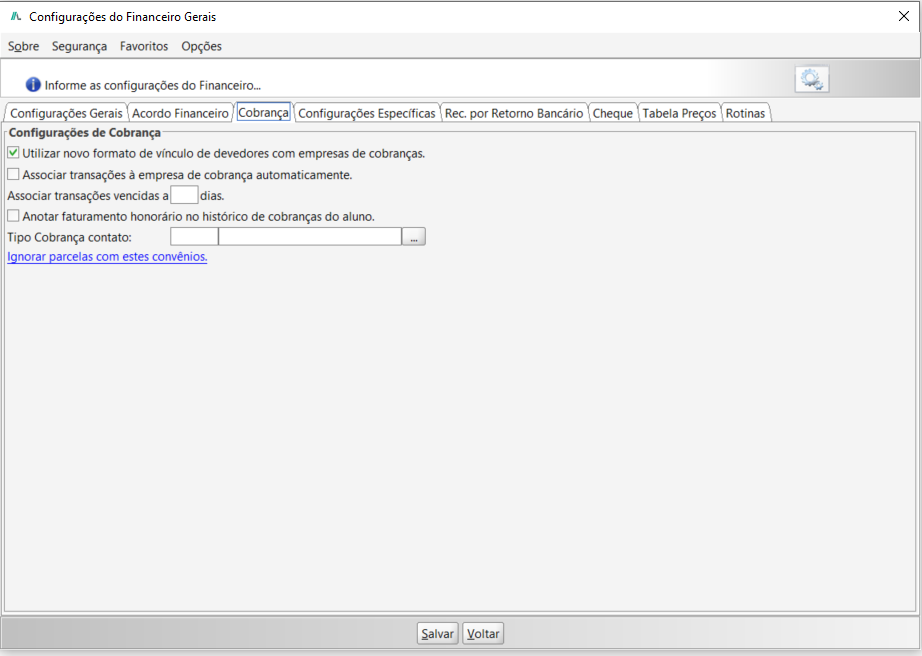 Acesse a aba Cobrança, e marque a flag Utilizar novo formato de veículo de devedores com empresas de cobrança.