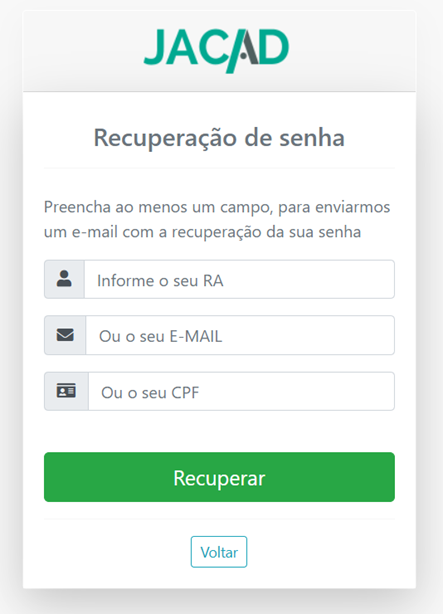 - Informe o RA; E-mail ou CPF