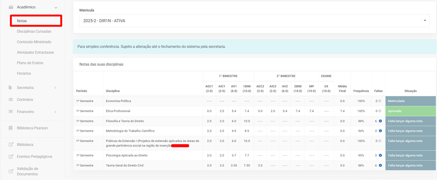 O menu de Notas é um dos principais recursos do Portal.