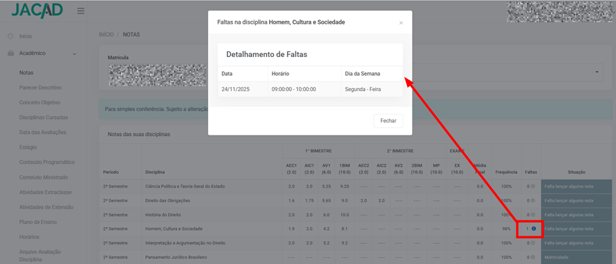 - Um ícone permite abrir os detalhes completos das ausências.