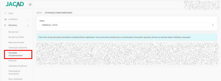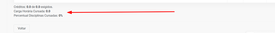 Também no fim da Página, na parte localizada no Rodapé do lado esquerdo, contém outras informações também que possam relevantes para o aluno consultar como Carga Horária Cursada e o seu Percentual total cursado de disciplinas.